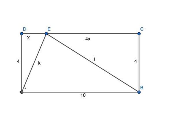 Najpierw oblicz, że x = 2. Skorzystaj z twierdzenia Pitagorasa w trójkącie DEA, aby obliczyć k. Skorzystaj z twierdzenia Pitagorasa w trójkącie ECB, aby obliczyć j. Następnie sprawdź, czy