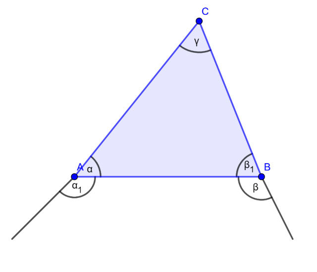 Narysuj dowolny trójkąt ABC i oznacz przy dwóch jego wierzchołkach po jednym kącie zewnętrznym. Czy suma tych dwóch kątów może równać się kątowi półpełnemu? Odpowiedź uzasadnij.