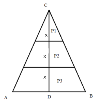 W trójkącie ostrokątnym poprowadzono dwie proste równoległe do podstawy, które podzieliły wysokość trójkąta opuszczoną na tę podstawę na trzy odcinki równej długości. W tym zadaniu musisz obliczyć stosunek pól powstałych w wyniku tego podziału figur.