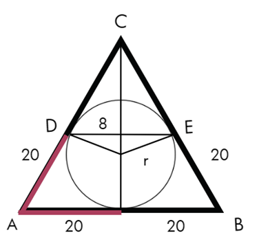 W trójkącie równoramiennym ABC podstawa AB ma długość 40 cm. W trójkąt wpisano koło, które jest styczne do ramion trójkąta w punktach D i E, |DE| = 8 cm. W tym zadaniu musisz obliczyć pole trójkąta DEC.