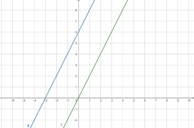 Wykres f przesunięto wzdłuż osi OX o 3 jednostki w lewo, w związku z tym nasz wzór wygląda następująco: 2(x - ( - 3)) = 2(x + 3) = 2x + 6