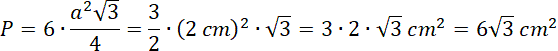 Oblicz pole sześciokąta o boku równym 2 cm. Mnożąc 6 razy pole trójkąta foremnego, o takim samym boku.