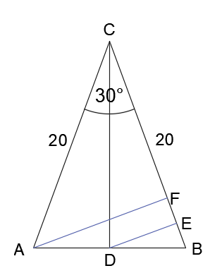 Dany jest trójkąt równoramienny o ramieniu 20 i kącie między ramionami równym 30°. Jaka jest odległość między środkiem podstawy a ramieniem trójkąta.