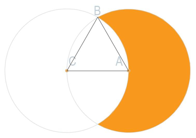 Dwa trójkąty ABC razem z łukami tworzą część wspólną obu okręgów:
