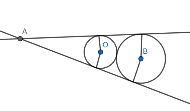 Dwa okręgi o promieniach równych 2 cm i 3 cm są styczne zewnętrznie. Dwie proste, z których każda jest styczną zewnętrzną obu okręgów, przecinają się w punkcie A. W tym zadaniu musisz obliczyć odległość punktu A od środka mniejszego okręgu.