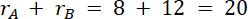 Promień mniejszego okręgu ma 8, a większego 12. Odległość od A do B ma 25.