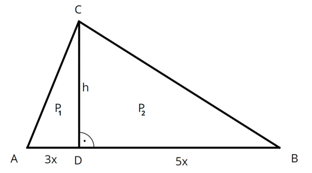 W tym zadaniu musisz obliczyć pole trójkąta ABC, wiedząc, że w trójkącie ABC wysokość poprowadzona na podstawę dzieli tę podstawę w stosunku 3:5, a pola powstałych trójkątów różnią się o