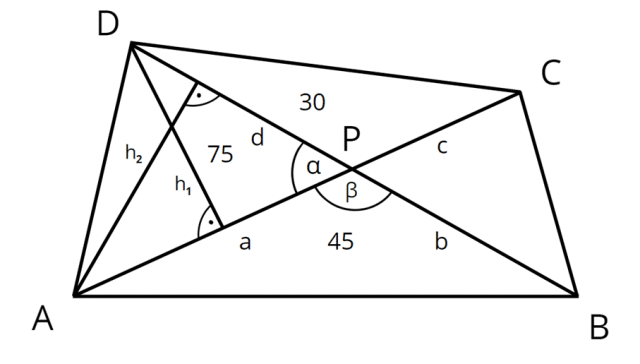 W tym zadaniu musisz obliczyć pole czwartego trójkąta, wiedząc, że przekątne podzieliły czworokąt na cztery trójkąty, pola trzech z nich są dane na rysunku w książce.