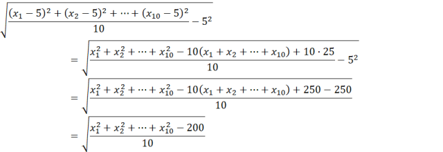 Wyznacz sumę kwadratów 10 liczb, które zmniejszono o 5, a poprzednio średnia arytmetyczna wynosiła 10, a odchylenie standardowej było równe 2.