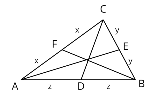 Trójkąty ADS i DBS mają równe pola, ponieważ podstawa obydwu trójkątów jest równa z oraz ich wysokość jest równa.