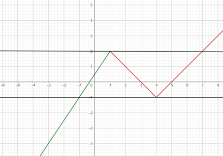 Aby określić punkt przecięcia się obu funkcji określmy funkcję g jako poziomą funkcję liniową o stałej wartości. Następnie należy odczytać z wykresu dla jakiej wartości takiej poziomej linii funkcja f przecięłaby się z nią dwukrotnie.