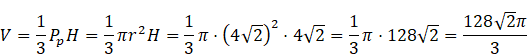 Korzystając z własności trójkąta szczególnego o kątach 45°, 45°, 90° wyznacz wysokość stożka (H) oraz promień (r) jego podstawy, a także średnicę (d). Następnie oblicz jego pole powierzchni całkowitej (Pc)oraz objętość (V).