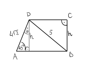 Zauważ, że wysokość poprowadzona z punktu D do podstawy, tworzy z kawałkiem podstawy na boki kwadratu, zatem, aby obliczyć wysokość, skorzystaj ze wzoru na przekątną kwadratu, rozwiąż równanie .