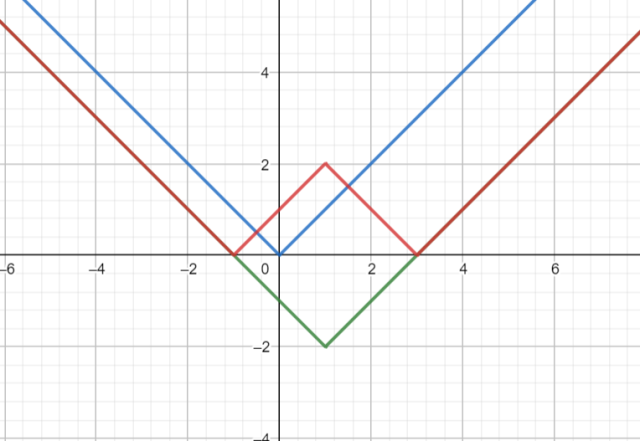 Następnie przesuń wykres o wektor [1, -2] – kolor zielony. (y = |x – 1| - 2)