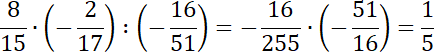 Pamiętaj, mnożąc lub dzieląc dwie liczby ujemne otrzymasz liczbę dodatnią, a mnożąc lub dzieląc liczbę dodatnią i ujemną – liczbę ujemną. Wykonaj mnożenie, a wynik pomnóż przez odwrotność ostatniego ułamka. Skracaj, gdy to możliwe.