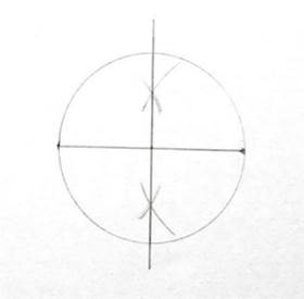 2. Z końców odcinka, przy pomocy cyrkla, zakreśl po dwa łuki o równym promieniu tak, by przecięły się w dwóch różnych punktach po dwóch stronach odcinka.