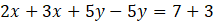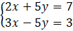 W metodzie przeciwnych współczynników musisz doprowadzić do takiej postaci układu równań, aby przy jednej zmiennej x lub y były przeciwne współczynniku. W tym układzie równań przeciwne współczynniki znajdują się przy zmiennej y i wynoszą 5 i –5. Dodajemy obustronnie obie strony równań, wyrażenia z y się redukują i otrzymujemy postać
