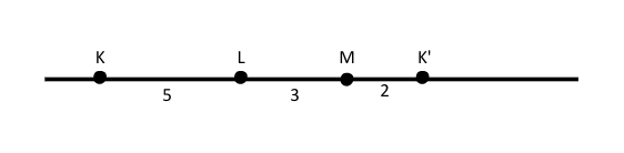 Punkt K może znajdować się po lewej stronie osi lub po prawej stronie osi (K’). Zatem odległość pomiędzy K i M może wynosi 2 lub 8 (5 + 3 = 8).