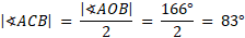 Zauważ, że kąty AOB i ACB są kątami środkowym i wpisanym, opartymi na tym samym łuku. Podobna sytuacja ma miejsce dla kątów BOC i BAC. Aby wyznaczyć ostatni kat trójkąta ABC skorzystaj z sumy kątów w tym wielokącie.