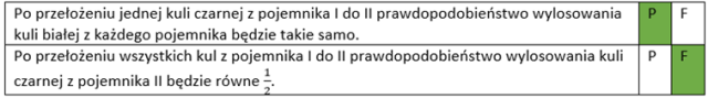 | Po przełożeniu jednej kuli czarnej z pojemnika I do II prawdopodobieństwo wylosowania kuli białej z każdego pojemnika będzie takie samo. | P | F |