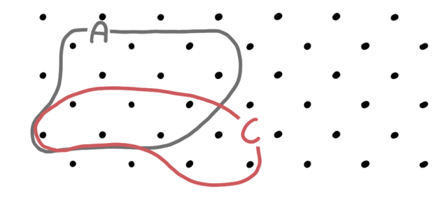 W zbiorze C musi znaleźć się 9 elementów, w tym 6 takich, które jednocześnie znajdują się w zbiorze A i C. Narysuj pętlę, w której znajdzie się odpowiednia ilość punktów – podane rozwiązanie jest rozwiązaniem przykładowym.