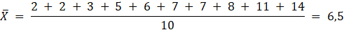 Podany zestaw liczb uporządkowany rosnąco to: 2, 2, 3, 5, 6, 7, 7, 8, 11, 14.