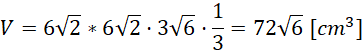 Z równania Pitagorasa wylicz długość krawędzi podstawy. Zastosuj wzór na wysokość trójkąta równobocznego alby otrzymać wysokość ostrosłupa. Zastosuj wzór na objętość ostrosłupa, jako iloczyn pola podstawy i wysokości. Otrzymany wynik podziel na 3.
