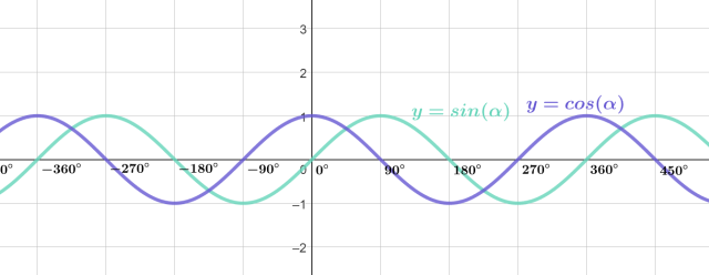 Wartości największe funkcji sinus i cosinus wynoszą 1. Przeanalizuj wykres obu funkcji w układzie współrzędnych: