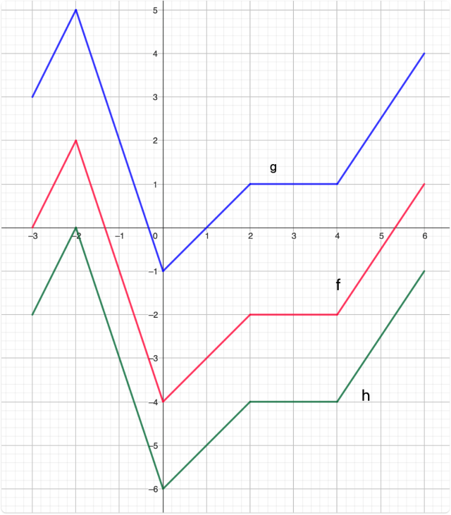 Aby narysować wykres funkcji g, przesuń wykres funkcji f o 3 jednostki w górę., oraz aby narysować wykres funkcji h, przesuń wykres funkcji h o 2 jednostki w dół.