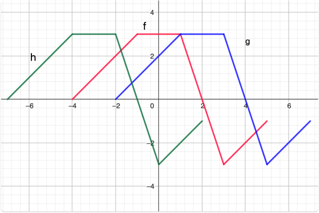 Aby narysować wykres funkcji g przesuń wykres funkcji f o dwie jednostki w prawo, natomiast aby otrzymać wykres funkcji h przesuń wykres funkcji f o trzy jednostki w lewo. Zauważ, że dziedzina funkcji g jest przesunięta o dwie jednostki w prawo, a dziedzina funkcji h o trzy jednostki w lewo. Zauważ również, że miejsca zerowe tych funkcji są miejscami zerowymi funkcji f przesuniętymi o odpowiednią ilość jednostek.