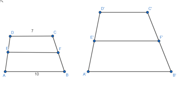 Wykonaj rysunek pomocniczy. Oblicz długość |EF|. Wyznacz skalę podobieństwa trapezu A’B’C’D’ do trapezu ABCD. Na koniec wyznacz długość odcinka |E’F’|.