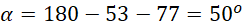 Suma miar wszystkich kątów w trójkącie wynosi 180o- stąd obliczysz kąt α.