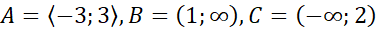 Naszkicuj przedziały zbiorów A, B i C. Odczytaj z nich podane relacje między zbiorami. Suma zbiorów oznacza, że sumujemy wszystkie wyrazy z dwóch zbiorów i zapisujemy w formie jednego. Część wspólna oznacza, że z obu zbiorów musimy wybrać jedynie te wyrazy, które się pokrywają w dwóch analizowanych zbiorach.