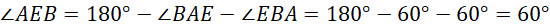 Aby znaleźć miarę kąta AEB, odejmij miary znanych kątów trójkąta ABE od