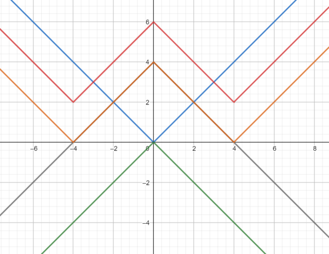 Następnie wykonaj odbicie wykresu względem osi OX – kolor zielony. (y = -|x|)