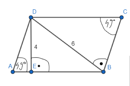 Oblicz długości boków i pole równoległoboku, jeżeli kąty ostry mają miarę 49°, a długości obu jego wysokości wynoszą odpowiednio 4 i 6. Wyniki zaokrąglij do jednego miejsca po przecinku.