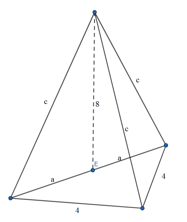 W tym zadaniu oblicz, jakie długości mają krawędzie boczne danego ostrosłupa, jeśli spodek wysokości jest środkiem przeciwprostokątnej wiedząc, że podstawą tego ostrosłupa jest trójkąt prostokątny równoramienny o przyprostokątnej długości 4, a wysokość ostrosłupa jest równa 8.
