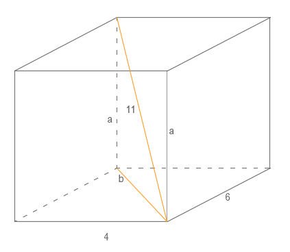 Dany jest prostopadłościan, krawędzie wychodzące z jednego wierzchołka wynoszą 4 cm i 6 cm a jego przekątna 11 cm. Znajdź długość trzeciej krawędzi.
