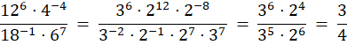 Zapisz każdą z liczb jako iloczyn potęg o podstawach 2 i 3. Następnie skorzystaj z praw działań na potęgach, uprość wyrażenie i oblicz jego wartość.