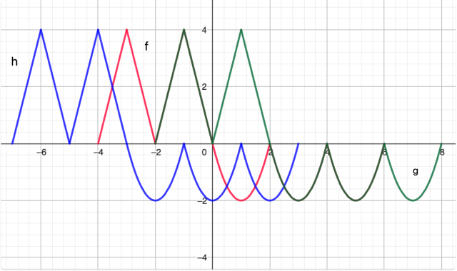 Aby narysować wykres funkcji g przesuń wykres funkcji f o dwie jednostki w prawo, natomiast aby otrzymać wykres funkcji h przesuń wykres funkcji f o trzy jednostki w lewo. Zauważ, że dziedzina funkcji g jest przesunięta o dwie jednostki w prawo, a dziedzina funkcji h o trzy jednostki w lewo. Zauważ również, że miejsca zerowe tych funkcji są miejscami zerowymi funkcji f przesuniętymi o odpowiednią ilość jednostek.