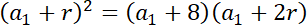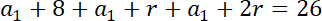 Dany ciąg arytmetyczny składa się z trzech liczb. Jeśli do pierwszej z nich dodasz 8, a drugą i trzecią zostawisz bez zmian, to tak otrzymany ciąg będzie ciągiem geometrycznym. Podaj te liczby, jeśli suma wyrazów ciągu geometrycznego wynosi 26.