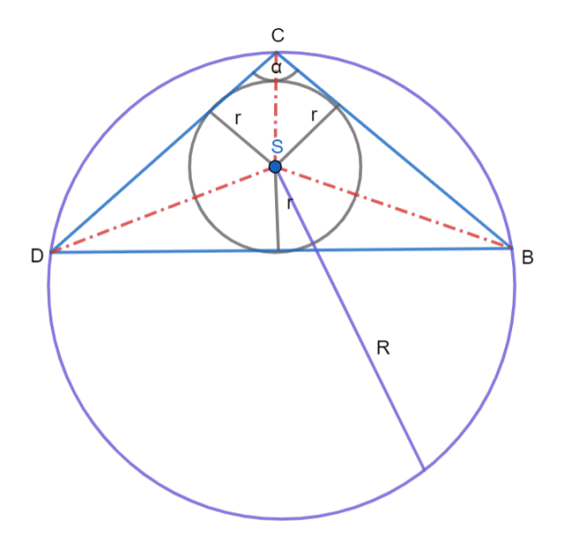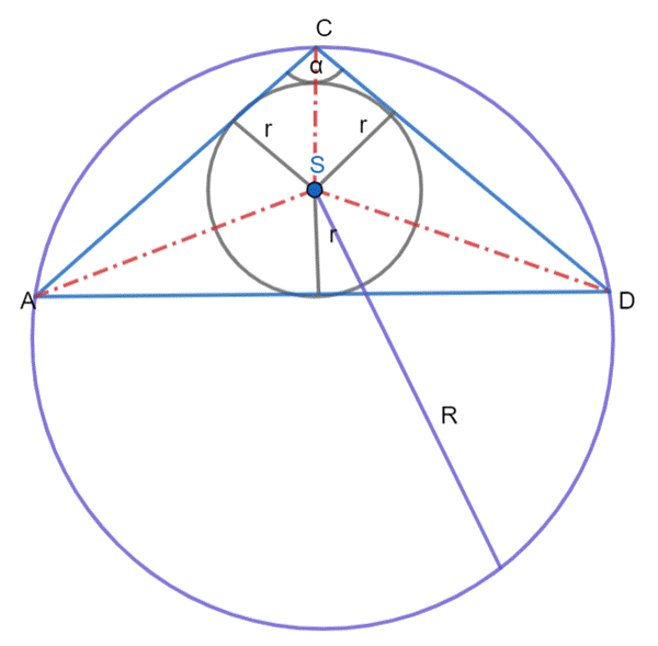 W tym zadaniu wyznacz długości boków: |AD| i |BC| z twierdzenia cosinusów, a następnie z twierdzenia sinusów oblicz promienie okręgów opisanych na trójkątach ADC i DBC, na koniec wyznacz stosunek tych promieni.