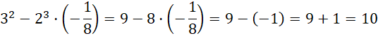 Najpierw wykonaj potęgowanie: pomnóż przez siebie tyle takich samych liczb, ile wynosi wykładnik potęgi. Następnie wykonaj mnożenie: pomnóż wynik drugiej potęgi przez ujemny ułamek – wynik będzie ujemny. Na koniec zastąp odejmowanie, dodawaniem liczby przeciwnej i dodaj do siebie dwie liczby dodatnie.