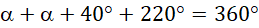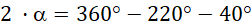Suma miar kątów w czworokącie wynosi 360°. Najpierw obliczasz kąt, który leży przy kącie 140°. Suma ich miar ma dać 360°. Następnie od 360° odejmujesz miarę kąta 40°, 220°, a wynik dzielisz na 2, ponieważ masz dwa kąty o mierze a.