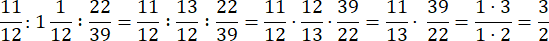 Aby podzielić ułamek przez ułamek, mnożymy pierwszy ułamek przez odwrotność drugiego. Poniższe działanie wykonujemy, zapisując obliczenia w kolejności występowania, czyli najpierw liczymy iloraz dwóch pierwszych ułamków, a następnie kolejny: