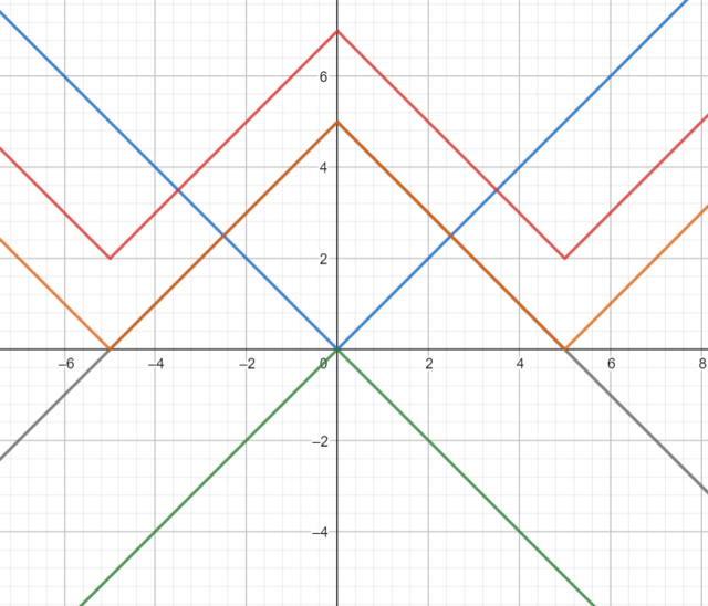 Przesuń wykres o wektor [0, 5] – kolor szary. (y = -|x| + 5 = 5 - |x|)