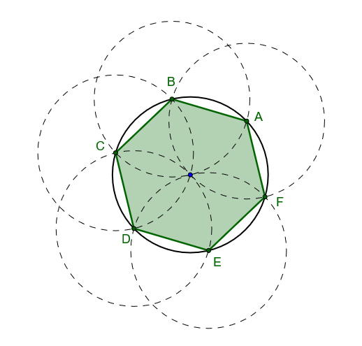 Musisz narysować dowolny okrąg, zaznaczyć na nim dowolny punkt i bez zmiany rozwarcia narysować kolejny okrąg wbijając igłę w ten punkt, wyjdzie okrąg przecinający pierwszy okrąg i w punkcie przecięcie rysować kolejne okręgi. Po narysowaniu 5 takich okręgów będzie 6 punktów, które połączone utworzą sześciokąt foremny.