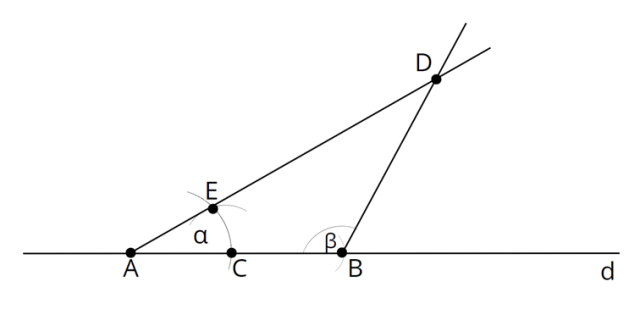 Zacznij od narysowania prostej d i zaznacz na niej punkt A. Następnie wbij cyrkiel w punkt A i zakreśl łuk na prostej d o promieniu równym długości odcinka c. Punkt przecięcia łuku i prostej d oznacz jako B. Następnie skonstruuj kąty α i β. Punkt przecięcia półprostych wychodzących z wierzchołków A i B oznacz jako D.