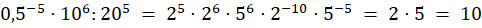 Zapisz każdą z liczb jako iloczyn potęg o podstawach 2 i 5. Następnie skorzystaj z praw działań na potęgach, uprość wyrażenie i oblicz jego wartość.