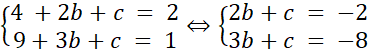 Podstawiamy współrzędne punktów pod wzór funkcji i tworzymy układ równań, z którego wyliczamy współczynniki b i c, dzięki czemu otrzymujemy ogólny wzór funkcji. Licząc wyróżnik trójmianu kwadratowego, okazuje się, że jest on ujemny, zatem postać iloczynowa nie istnieje (ponieważ rzeczywiste miejsca zerowe nie istnieją). Korzystając z definicyjnych wzorów, wyznaczamy współrzędne wierzchołka paraboli i tworzymy wzór funkcji w postaci kanonicznej.